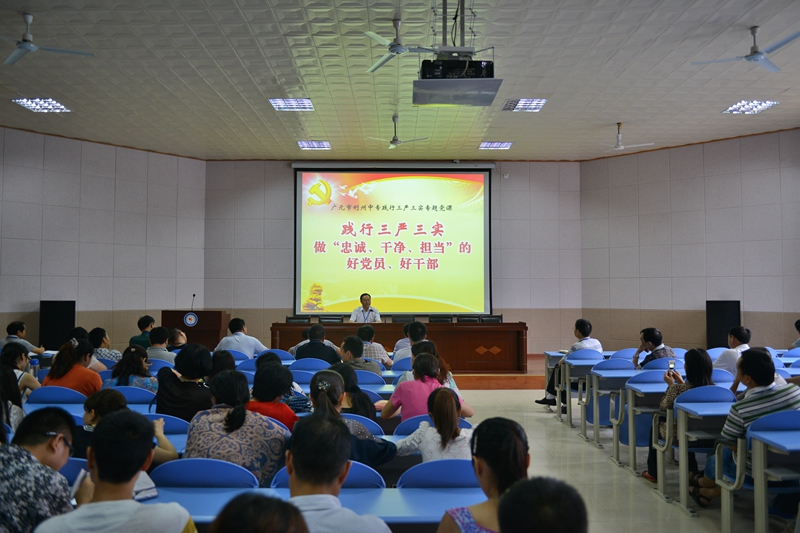6月23日下午,李锦校长讲授《践行“三严三实”,做“忠诚、干净、担当”的好党员、好干部》专题党课,他结合学习体会和当前学校发展的形势,阐述了“三严三实”的重大意义和丰富内涵,分析了学校“不严不实”的具体表现,讲解了落实“三严三实”的实践要求。全校教职工到场听课。