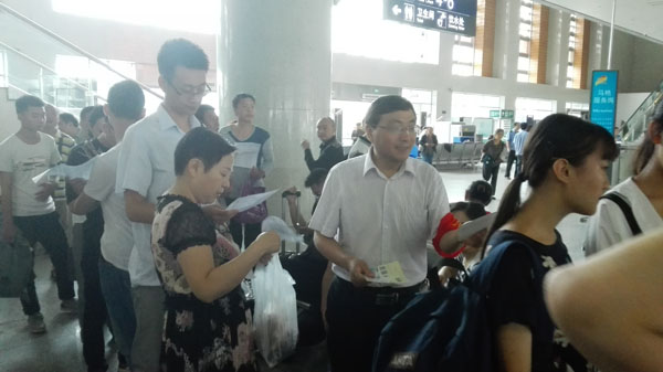 尽管下着大雨,两个支部的全体党员及入党积极分子早上8:00准时来到活动地点,当看到因突降暴雨没来得及准备遮雨用具的出站旅客时,支部党员主动为旅客打伞遮雨、帮助他们搬运行李,热情为他们提供服务;当听到广元火车站将于7月1日进行升级改造,路经广元的列车停靠地点将改停在广元火车南站、昭化站,可能会给在广元站上下的旅客带来不方便时,支部党员积极向相关部门联系,领取资料,深入到上西长途汽车站、饭店、社区等人口密集地方,向旅客、居民发放《乘车指南》等宣传资料,让广大群众及时了解列车??空镜慵暗秸臼笨?。