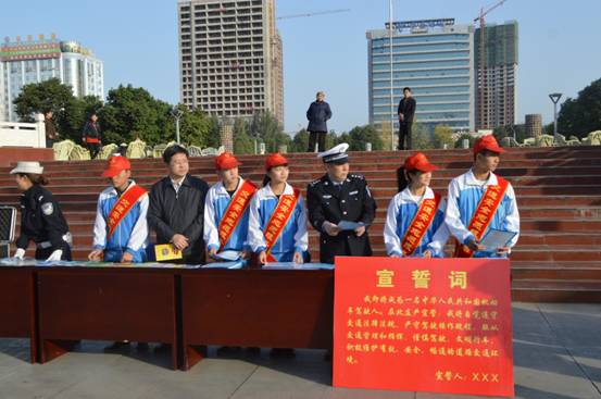 12月2日是第四个“全国交通安全日”。为进一步提升全民通行规则意识、守法意识、社会责任意识、文明交通意识,使“122”交通安全日更加深入人心,广元市公安局交警支队组织开展了以“拒绝危险驾驶、安全文明出行”主题的活动。我校33名青年学生志愿者分别以转盘路交警岗亭、劳动大厦交警岗亭和利州广场会场三路参加了这次活动。