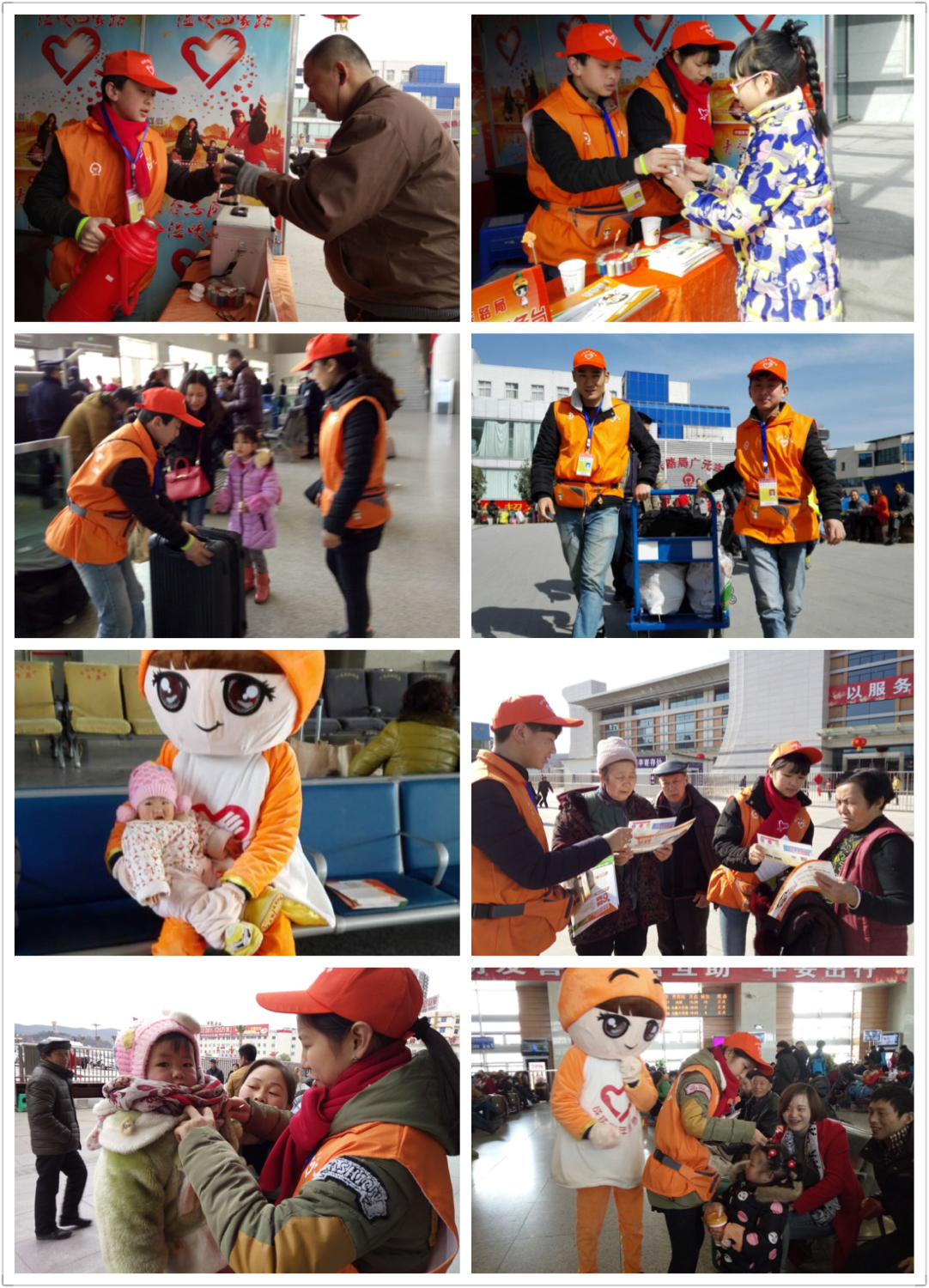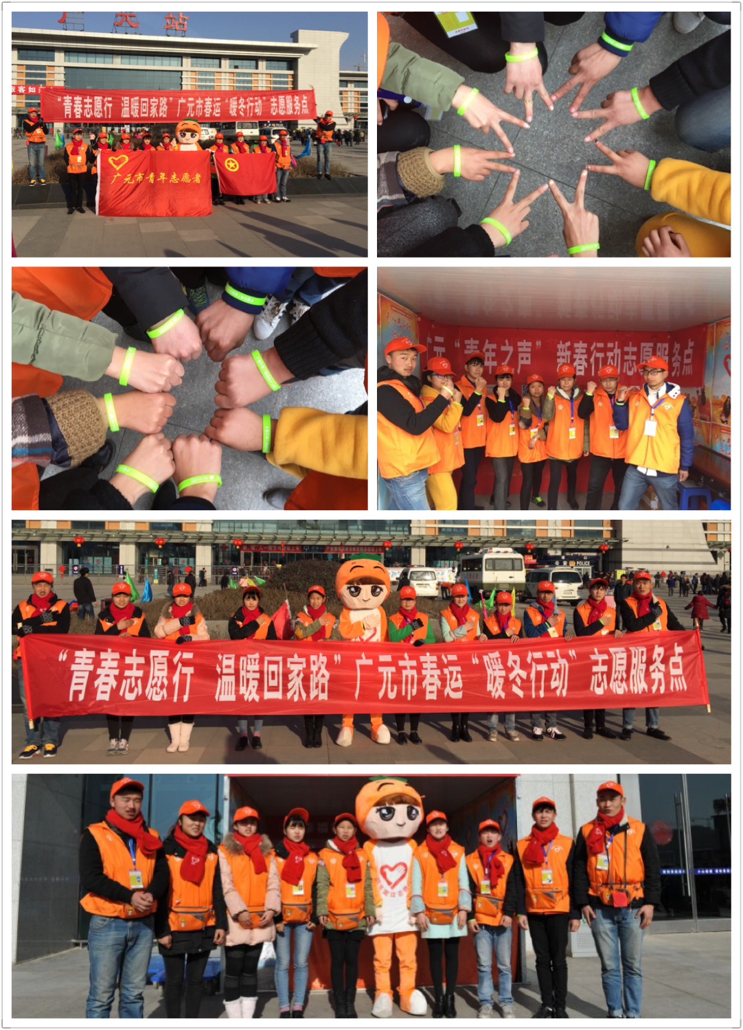 轻快的步伐,阳光的微笑,四射的青春,2016年2月10日,农历正月初三,利州中专的青年志愿者开启了服务铁路春运志愿活动的征程,在这里,一支身着橙色服装的青年队伍,他们奔跑往复、挥汗如雨,认真而执着地为出行旅客服务;在这里,他们笑靥似花,照顾周到,用爱心和温馨温暖匆匆的人群。他们与铁路职工共同坚守、共同奋斗,共同感受着春运!他们,就是服务广元铁路春运的利州中专青年志愿者。