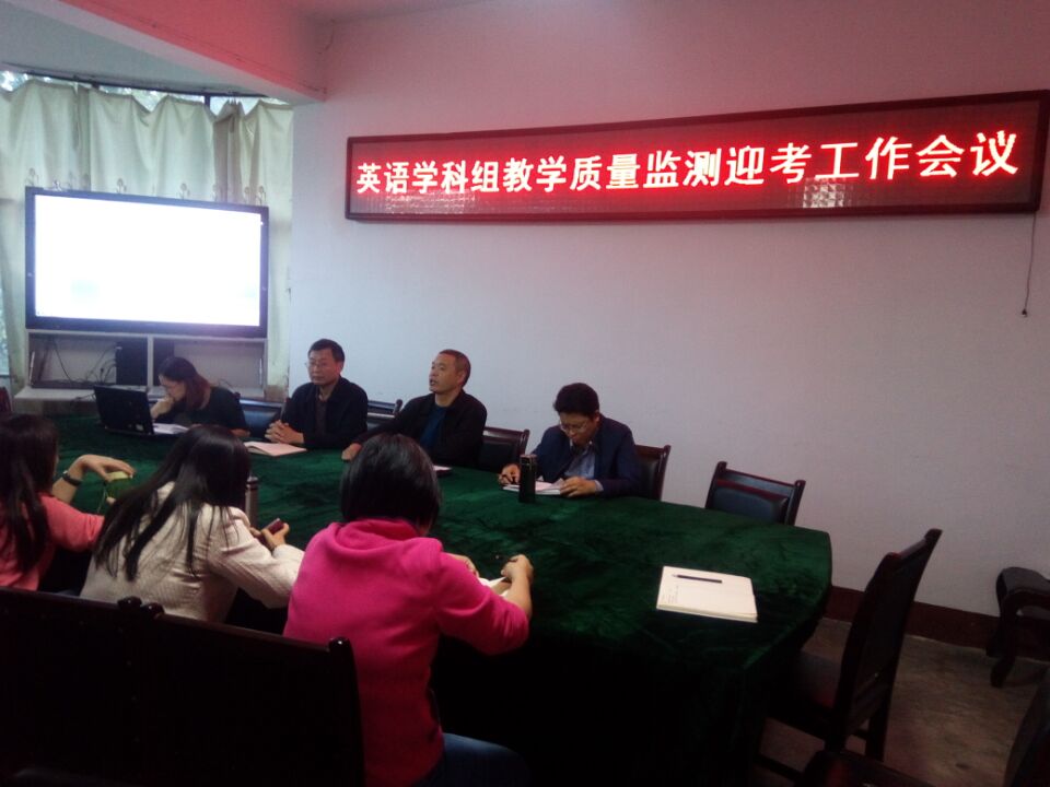 为了做好2016年11月18日全省中职英语学科质量监测迎考工作,学校英语学科组于2016年10月18日下午五点在教学楼3-4会议室组织召开了迎考工作会议。英语组全体教师及教务科李文化科长,王兴兵副科长,教科室彭升奇主任参加了会议。会议由王兴兵科长主持。