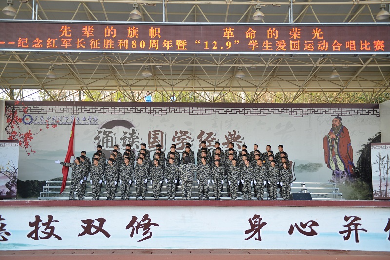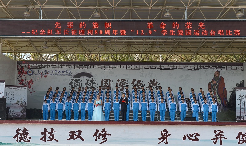 为纪念红军长征胜利80周年,铭记12·9爱国运动,教育学生继承光荣传统,弘扬民族精神,立志报效祖国,进一步推进校园文化建设,丰富学生文化生活,展现学生的精神风貌,12月7日下午我校学生科、团委组织的以“先辈的旗帜,革命的荣光”为主题的爱国歌曲大合唱在运动场拉开帷幕。全部班级参加了比赛,全校教职工组织观看。
