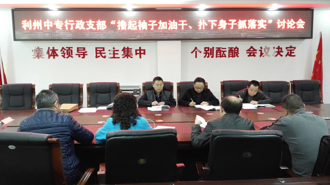 ??? “撸起袖子加油干,扑下身子抓落实,改革创新促跨越”。3月10日,根据学校党委统一部署安排,利州中专行政党支部在学校行政楼四楼会议室召开专题学习讨论会。会议由支部书记向珏同志主持,学校党委副书记、校长李锦同志参加此次讨论会。