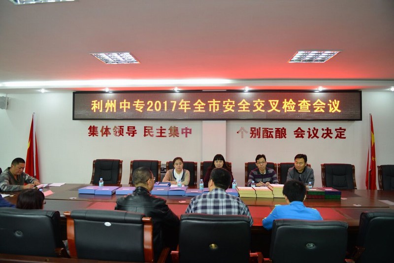 2017年4月20日上午,市教育局安办李主任、081中学丁副校长、821中学朱主任等一行来我校进行全市安全工作交叉检查,学校贾副校长、安保科马主任等陪同检查。检查结束后,在学校四楼会议室召开安全工作座谈会,贾副校长向检查组一行详细汇报了我校安全工作。检查组李主任等对我校的安全工作成绩进行了肯定,并对薄弱环节及不足进行指出,提出相关建议,落实整改,使我校安全工作更上一层楼。