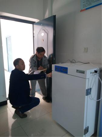 伏俊主任检验师和李永主任检验师对尿液分析仪进行检测