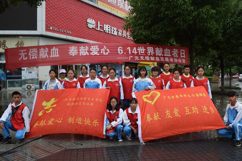 为纪念第十四个“世界献血者日”,弘扬“无偿献血,奉献爱心”的人道主义精神,做好无偿献血工作的宣传,确保全民无偿献血、患者安全用血,6月14日上午9时,利州中专20余名新风尚志愿者来到广元市东坝利州广场举行志愿者献血日相关活动。