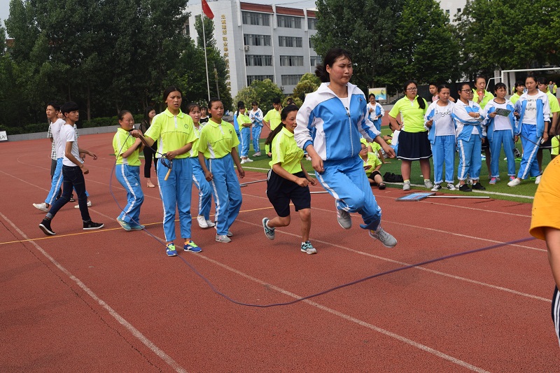 紧接着进行的是集体跳绳比赛。摇绳跳绳的同学们配合默契,整个动作整齐划一,如鱼贯入,现场气氛热烈,学校青年教工团支部老师的参与将比赛推入高潮,他们一次次的努力,坚持,为全体学生树立了榜样,他们的青春气息感染着每一个人。