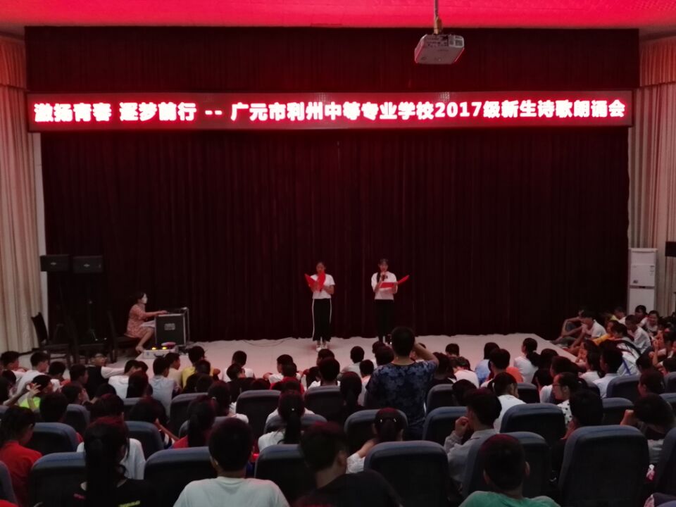 为培育和弘扬社会主义核心价值观,落实“立德树人”的根本任务,丰富新生军训生活,8月24日晚,利州中专 “激扬青春 逐梦前行” 2017级新生诗歌朗诵会在学术报告厅如火如荼的进行,全体新生、军训教官及新生班主任老师参加。
