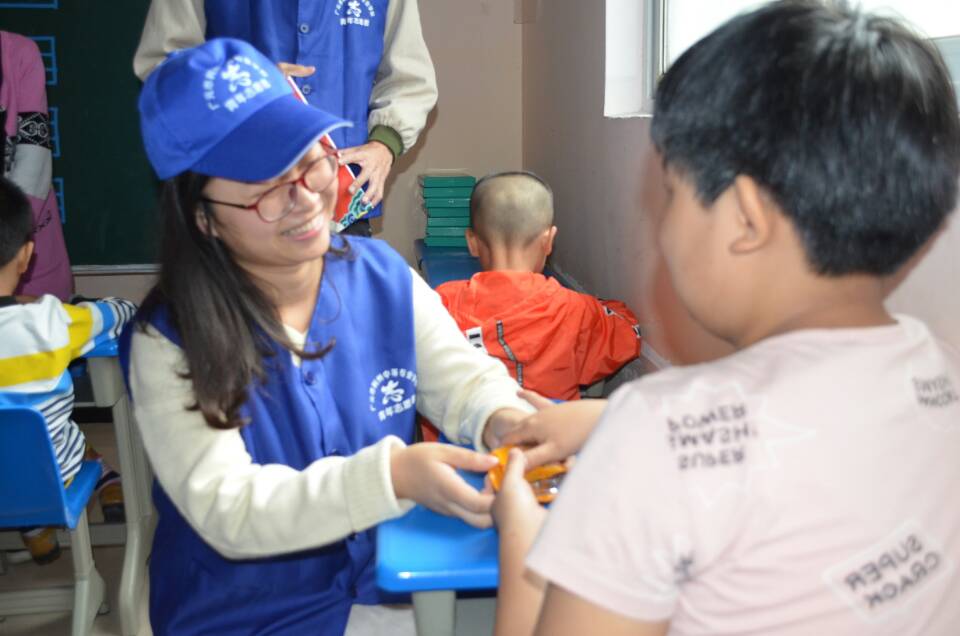 在中秋佳节即将到来之际,9月27日下午,利州中专新风扇志愿者社团的同学们来到“小海龟”特教中心与自闭症孩子们共同庆祝中秋佳节。活动伊始,志愿者带领小朋友围坐在一起听志愿者代表讲述嫦娥奔月的故事,并将自己精心准备的爱心月饼一一分给小朋友,陪着他们吃月饼。自闭症孩子感受到周围的热烈气氛,与志愿者们渐渐交流起来,甚至以亲吻的方式表达他们对志愿者的喜爱之情。分享完月饼之后志愿者们陪小朋友展开了户外活动,活动中,孩子们和志愿者的欢笑声伴着追逐声,其乐融融。
