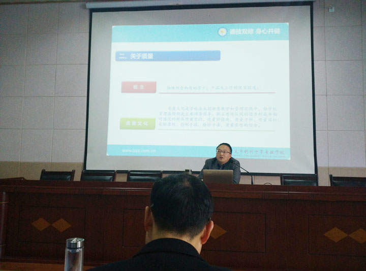 赵刚副校长为“以质量立命、以标准引领、以制度保障,加强教学诊断与改进,全面推进学校各项工作”为题,为全校教职员工开展了教学工作诊断与改进专题讲座。赵刚副校长从学校基本情况、专业发展与建设情况、实训室建设及实训条件、教科研发展情况及近三年学校所取得的荣誉等方面分析了学校现状,以习近平总书记十九大报告及省市各级职业教育相关文件为理论和政策依据,以国家经济转型发展升级为背景,阐述了“提升办学质量”的重要性,从“由来、概念、内涵、背景、目的和意义,理念、方针和程序、内容及任务,与评估的区别”等方面对“教学工作诊断与改进”进行了详细解读。结合学校实际,学校要切实建立“主体责任落实、协同推进、工作培训、质量监控反馈、状态数据系统管理、专家库咨询、诊改交流共享、工作考核奖惩”等十项工作机制;搭建工作平台,建立目标和标准,健全组织机构,构建质量保障体系;要加强教职员工政策水平提升培训,提高师生素质,助推学校全面发展。