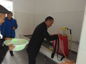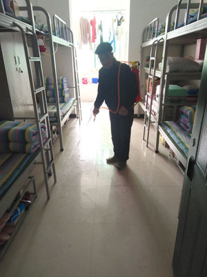 学校领导高度重视师生健康。总务科根据学校布置于2017年12月11日上午,组织消杀人员用84消毒液、优化溴氰菊酯等药物,对学校的教室、宿舍、食堂及校园全方位进行防害除菌药物消杀。预防肺结核疾病的传播。学校苏克难副校长现场指挥工作,全方位不留死角消杀,达到预防疾病的目的,确保全校师生有个健康的生活工作环境.
