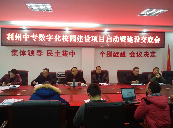 2017年12月12日上午,我校组织召开了“利州中专数字化校园建设项目启动暨建设交底工作会议”,同时宣布成立“数字化校园项目推进工作组”为项目实施过程提供监管与协助。赵刚副校长、贾相成副校长、苏克难副校长,相关负责同志与项目实施企业代表参加了会议。