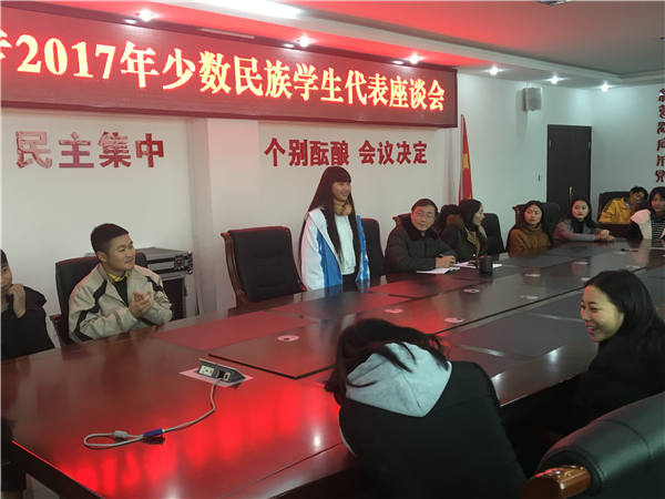 2017年我校开始全面扩招凉山州学生,在校领导的积极动员工作后,至今有六十余名盐源县的学子在我校就读。至此2018年元旦佳节到来之际,我校党委书记杜建新同志在休息的时间组织了盐源县在校就读学生开展了交流座谈会。在会上,杜书记和学生亲密的交谈,学生一一进行了发言,都表达了对学校的生活感到满意,对未来的生活表示向往,整个会议过程中氛围活跃。杜书记全程在记录学生的谈话内容,并不时的现场给与解答,在会议最后,杜书记表示了学校对于盐源学子的欢迎,肯定了盐源学子在校努力学习和良好的表现,并对盐源学子提出了殷切的希望和美好的节日祝福。