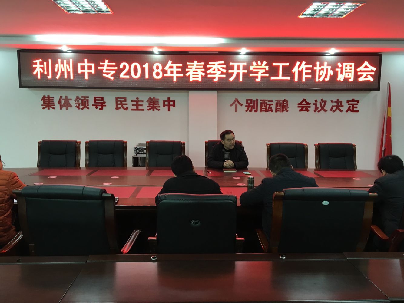2018年2月23日上午,学校组织召开2018年春季开学工作协调会,教务科、学生科、安保科、实习实训科、总务科、财务室、招就办等科室负责人及相关工作人员参加了会议,会议由贾相成副校长主持。