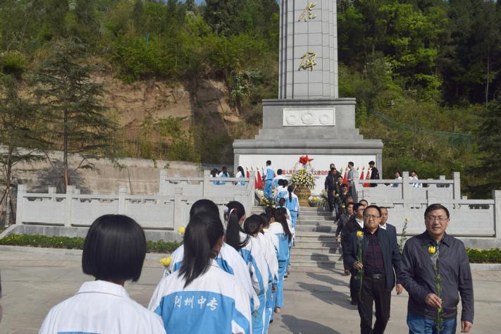 全体党员干部在肃穆的气氛中重温入党誓词。最后,全体师生怀着崇敬的心情绕墓一周,把手中一朵朵寄托哀思的菊花敬献给在烈士墓前。