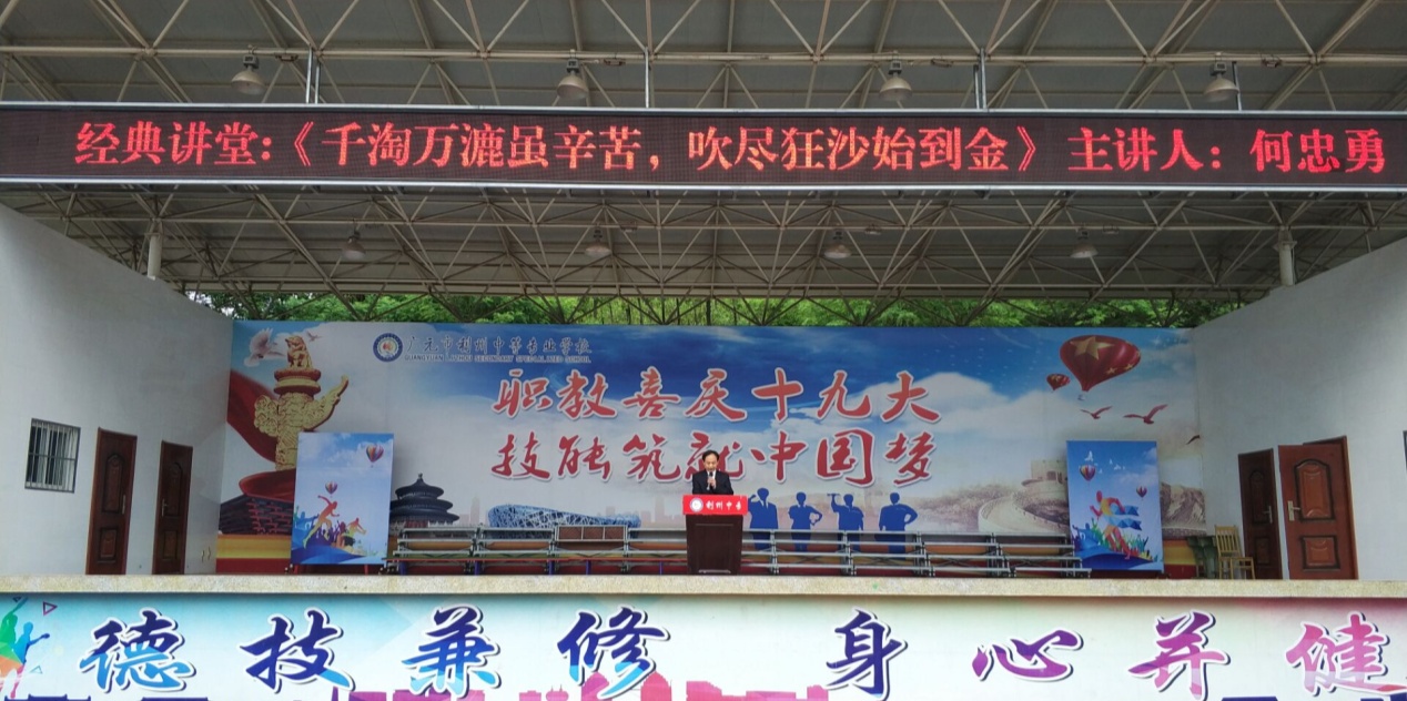 4月23日是一年一度的“世界读书日”,为了进一步深入贯彻习近平总书记重要讲话精神,传承和弘扬中华传统文化,上午10点,利州中专2018年春季经典讲堂第1讲开讲,学校2000余名师生齐聚田径场,认真聆听和感受了何忠勇老师主讲的题为“千淘万漉虽辛苦,吹尽狂沙始到金”的专题讲座。