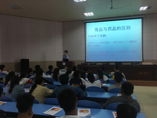 邱代萍副主任语重心长告知同学们:毒品毁灭自己、祸及家人、危害社会。她要求同学们不要因为自己的无知、好奇与任性,毁掉了原本可以更加美丽的人生,当面对不良诱惑时,要从内心坚决的说“不”,努力学习,提升自我,用所学知识与技能回报社会。