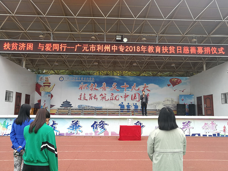10月17日,是国家扶贫日,也是国际消除贫困日。利州中专积极响应国家和市教育局的号召,举行了“扶贫济困、与爱同行”2018年教育扶贫日慈善募捐活动,倡导教师捐出自己一天的工资,学生捐出自己一天的零花钱,以实际行动奉献自己的爱心。