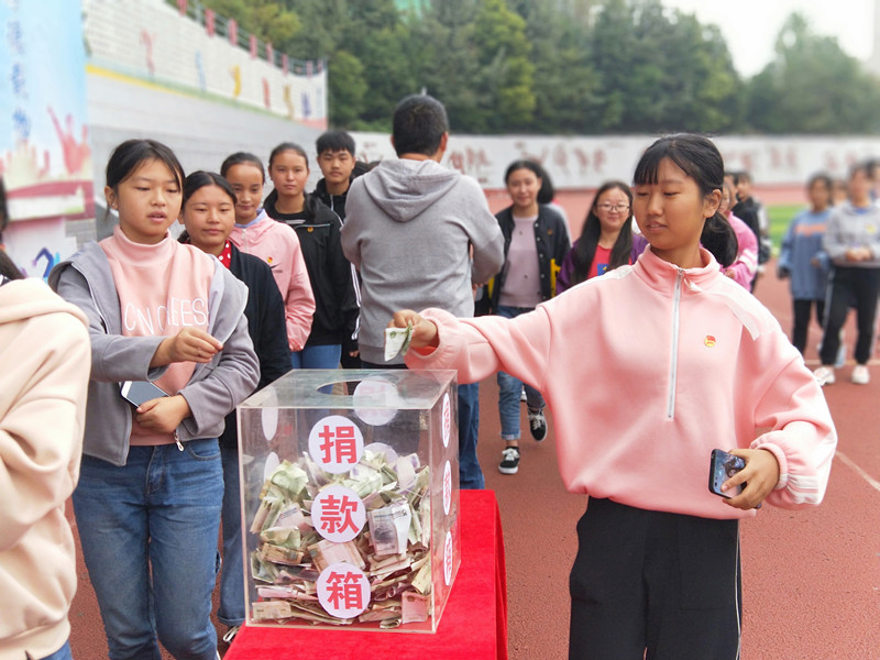 上午10点,慈善募捐仪式在学校田径场举行,老师代表宣读了“扶贫济困、与爱同行”倡议书,全校41个班级排成长长的队伍,纷纷走上前,将自己的零花钱郑重的投入到捐款箱。