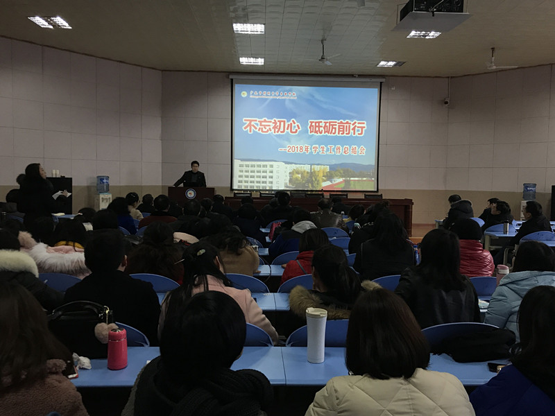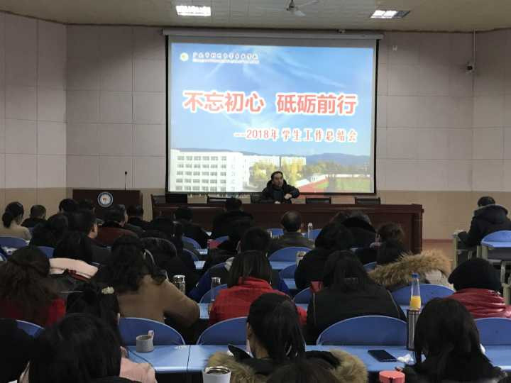 学生科王兴兵科长以《不忘初心,砥砺前行》为题总结了2018年学生工作,他主要从四个方面展开,包括学情分析、2018年度主要工作、存在的问题、下一步工作思路。这不仅是对我校学生管理和共青团工作取得主要成绩的全面总结和回顾,更是对新一年学生工作的部署,同时号召全体教职员工要坚定信心,奋发有为,撸起袖子加油干,形成全员育人的氛围和守纪乐学的校园风气。