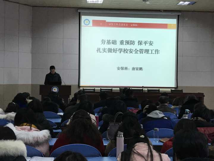 安保科唐家鹏科长作了《夯基础、重预防、保平安,扎实做好学校安全管理工作》的交流发言,主要对学校2018年安全管理工作的全面回顾。