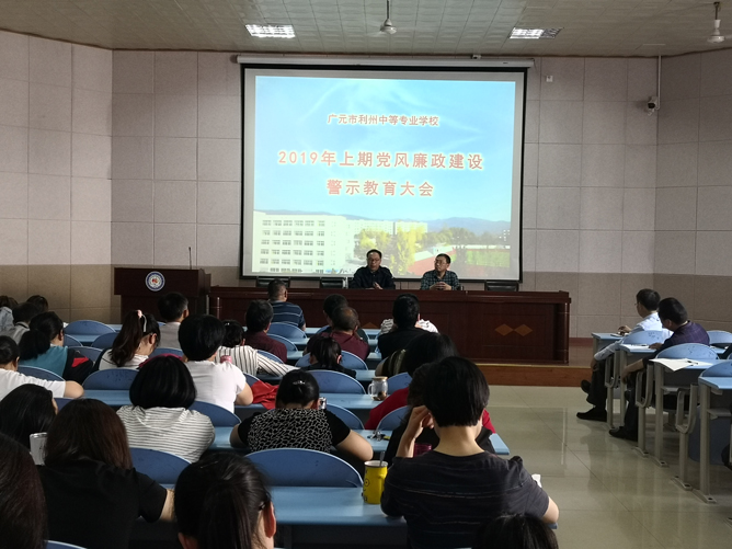 ????? 4月24日下午,利州中专认真落实省委、市委的工作部署,在学校二楼会议室召开“党员干部、公职人员‘赌博敛财’问题专项整治工作会”和“党风廉政建设警示教育大会”,持续推进“赌博敛财”专项整治工作,加强宣传学习力度,将纪律挺在前面,突出警示教育、预防教育,营造风清气正、遵纪守法的校园氛围,让全校教职工在纪律约束下,不断增强教师职业道德素养,认真干好本职工作。