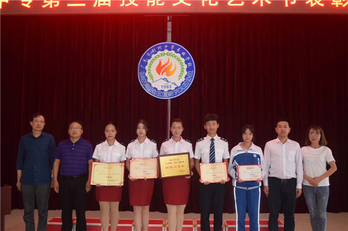 闭幕式第三项,教务科郑敏科长主持对本届技能文化艺术节中获奖团队和学生进行颁奖。本届技能文化艺术节,共有7个专业的195人参加了11个项目的专业技能比赛;343人参加了文化艺术综合项目的展评。共评出团体奖14个,一等奖的19名,二等奖的27名,三等奖的43名,优秀奖41名,不论是比赛规模还是项目数量都是历届之最。