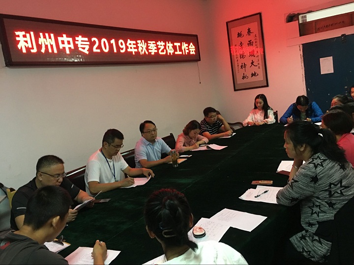 2019年9月4日,学校召开2019年秋季艺体工作会议。会议讨论了本期各专业、各年级体育与艺术教学内容设置情况,讨论了艺体组第二课堂活动项目及具体实施细则。会议确定了体育与艺术教学的基本原则,即体育艺术教学与专业相结合、知识性与趣味性相结合、运动技能培养与运动习惯培养相结合,课内与课外相结合。