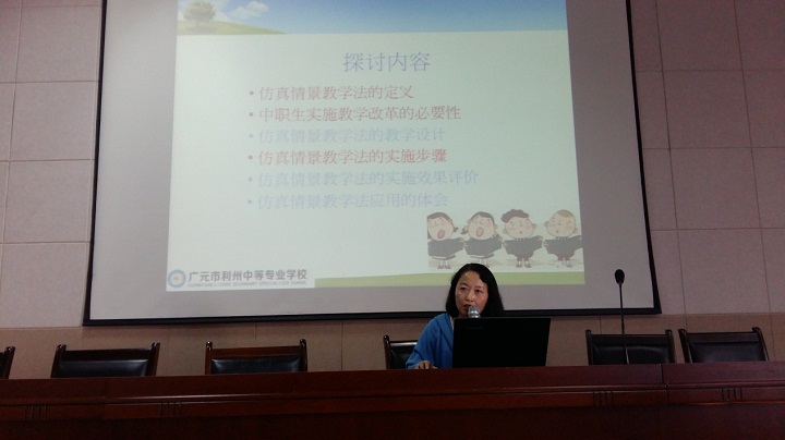 讲座首先介绍了仿真情景教学是以教师为主导学生为主体,使学生直观、真实的在模拟真实的现场中进行体验,主动的学习知识的课堂教学方法。其次,介绍了当前中职学校学生在课堂上的表现,强调了课堂教学改革对中职教育的重要性和必要性。最后,详细讲述了仿真情景教学法的教学设计、实施步骤、效果评价和应用的体会。建议老师选择真实的案例让学生进行分析和讨论,设置自己的情景剧本并向全班学生演示,最后针对演示的过程进行辩论,在此过程中使学生自主的发现问题、解决问题。汇报中,王老师讲述了大量的教学案例并播放了应用仿真情景教学法的课堂活动视频,生动的向全校教师展现了真实的课堂教学情景。让全体教师直观感受到应用仿真情景教学法的成效,它让原本沉闷的课堂,兴趣缺缺的学生,转变为学习动机强,对课堂充满好奇和兴趣的自主学习的个体。