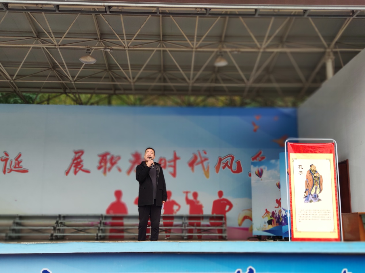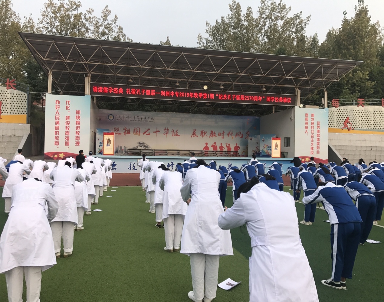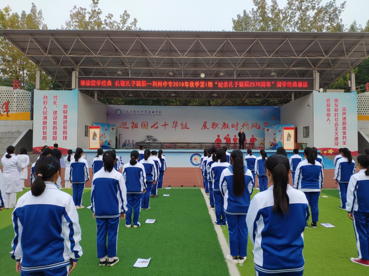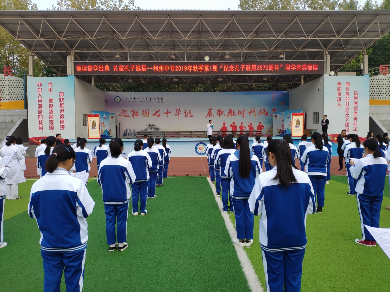 为礼敬至圣先师,弘扬传统文化,营造书香校园, 9月28日上午8时,利州中专在田径场隆重举行“诵读儒学经典、礼敬孔子诞辰”--“纪念孔子诞辰2570周年”国学经典诵读活动,2000余师生齐诵儒学经典,共同纪念这位华夏历史上最璀璨的文化先贤,活动由学生科何梁老师主持