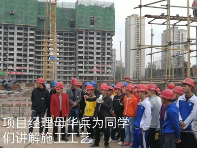 在现场, 邓松主任再次强调了安全要求,然后由四川豪运建设集团工程部部长刘孝青和项目部经理母华兵对整个和成原著小区的规划特色、施工组织、安全管理、建筑法规等全面介绍。然后5位专业课老师们各带一组人员,首先进行了现场分组参观、讲解答疑。其次,邓松主任、李清泉科长、朱从明老师分别就工地材料堆放、钢筋加工、脚手架搭设、模板安装、砌筑墙体、混凝土养护、抗滑桩受力分析、人工挖孔桩施工注意事项等向同学们一一作了现场集中讲解;最后工地项目技术负责人就工程概况、施工工艺、及建筑专业发展前景等与师生进行了热情交流。