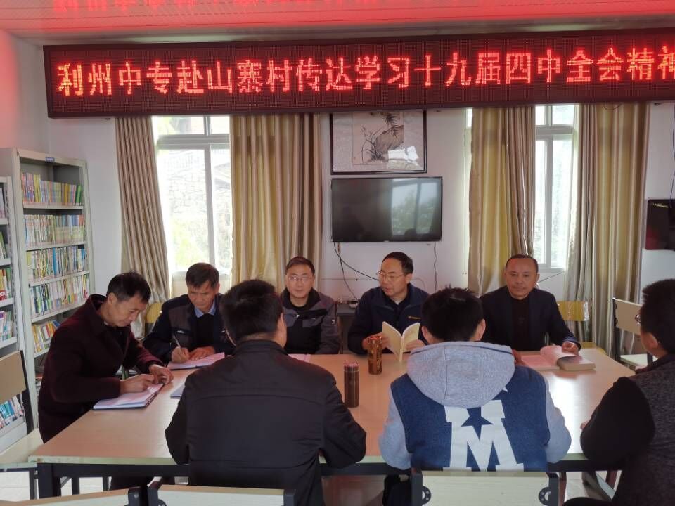 11月7日,学校校长李锦来到帮扶贫困村――旺苍县国华镇山寨村,为村两委班子、驻村工作队全体成员讲党课,组织大家学习了党的十九届四中全会精神。党委书记杜建新、副校长苏克难、培训科科长李洪兵参加了学习。