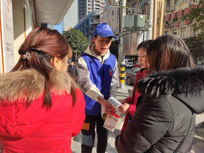 12月1日,我校青年志愿者走上街头,为来往的路人发放预防艾滋病的宣传资料,宣传艾滋病传播的途径、危害以及如何远离艾滋病等方面的内容,并为其佩戴红丝带。