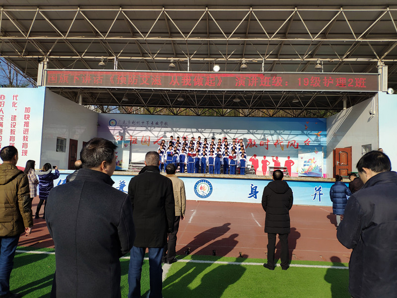 19级护理2班以《预防艾滋,从我做起》为题作国旗下讲话。号召全体同学积极行动起来,携手遏制艾滋,共建美好校园。国旗下讲话后,同学们还为老师们佩戴红丝带。