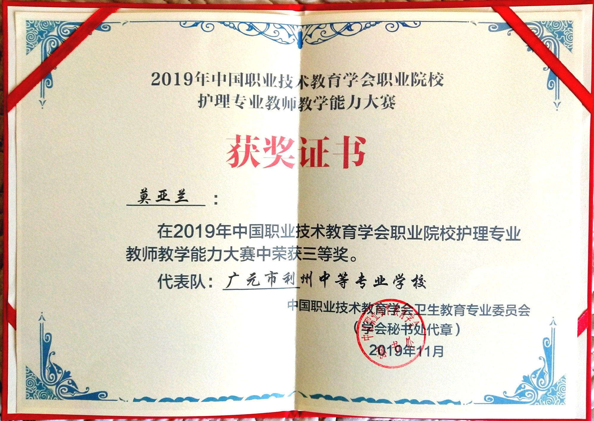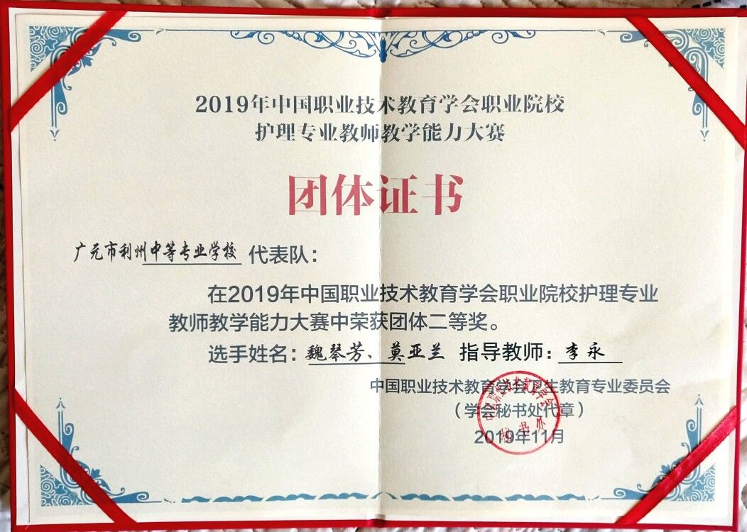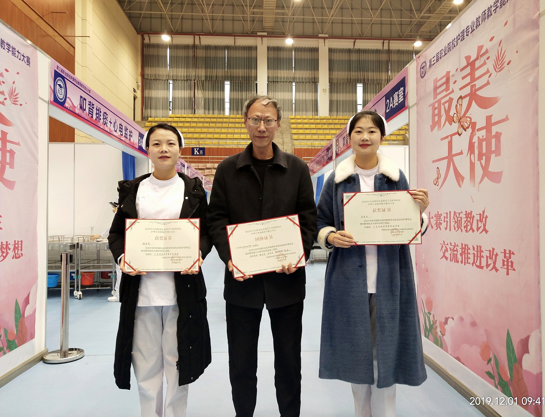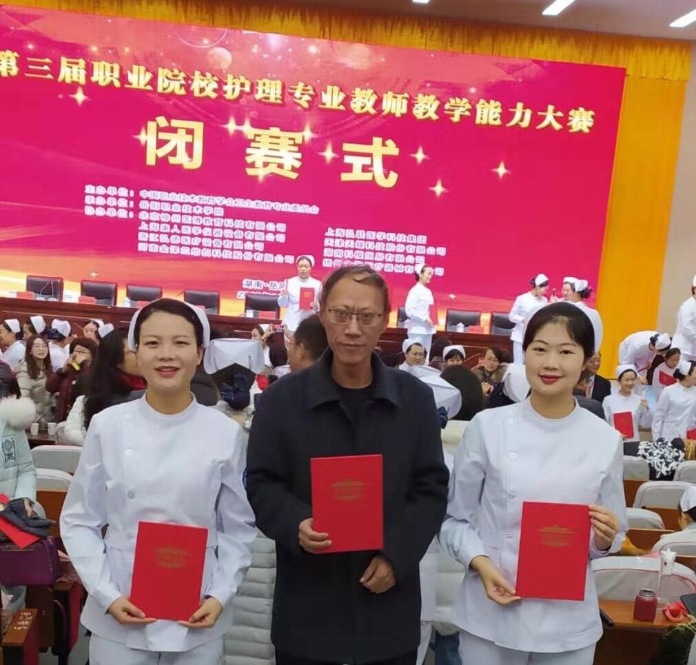 2019年11月29日至2日,全国第三届护理专业教师教学能力大赛在湖南岳阳隆重举行。我校医卫教学部由李永主任亲自挂帅带领魏琴芳、莫亚兰两位老师组成代表队参加了所有赛项的角逐,分别荣获个人二等奖和三等奖,同时学校代表队获得团体二等奖。