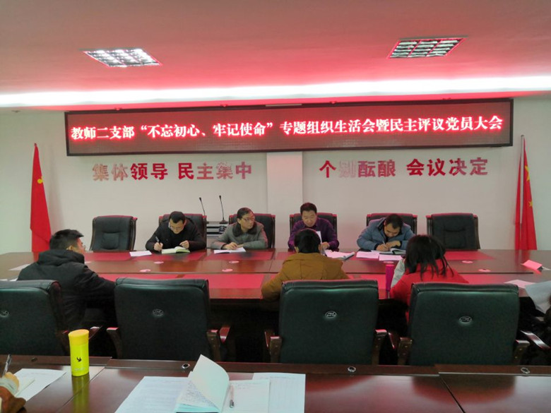 12月18日下午,教师二支部在学校行政楼四楼会议室召开“不忘初心,牢记使命”专题组织生活会暨2019年民主评议党员大会,会议由支部书记邓松同志主持,学校党委书记杜建新同志出席会议。