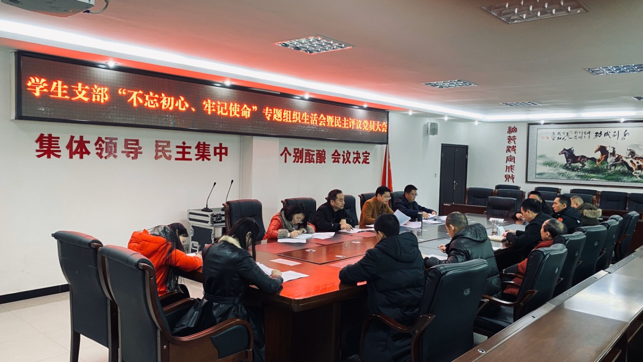 12月20日上午,学生支部召开“不忘初心,牢记使命”专题组织生活会暨2019年民主评议党员大会,学校党委委员贾相成同志到会指导,支部书记王兴兵同志主持会议。