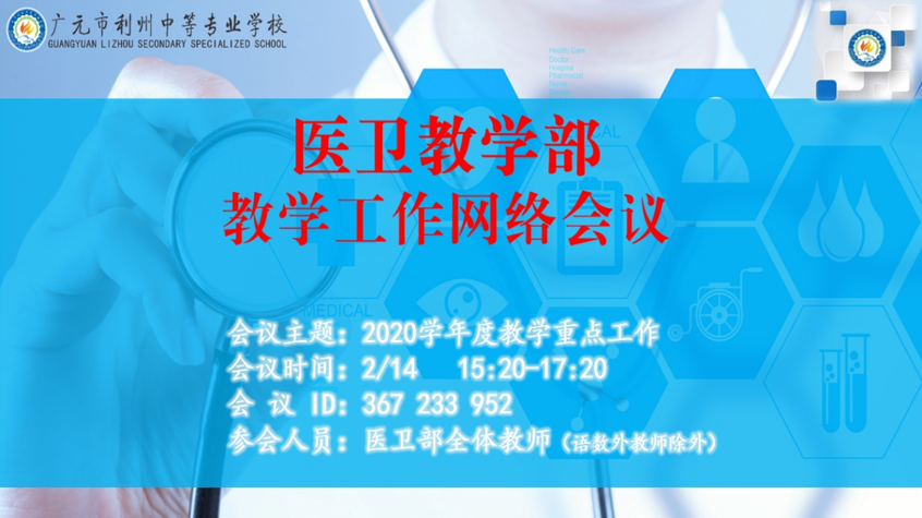 02月14日,医卫教学部召开了2020学年度教学工作网络会议,研究部署部门“新冠”病毒疫情防控工作和新学期开学教学工作?;嵋橛山萄Р坷钣乐魅沃鞒?,学校赵刚副校长、教务科郑敏科长、全体医卫教学部专业课教师参加会议。
