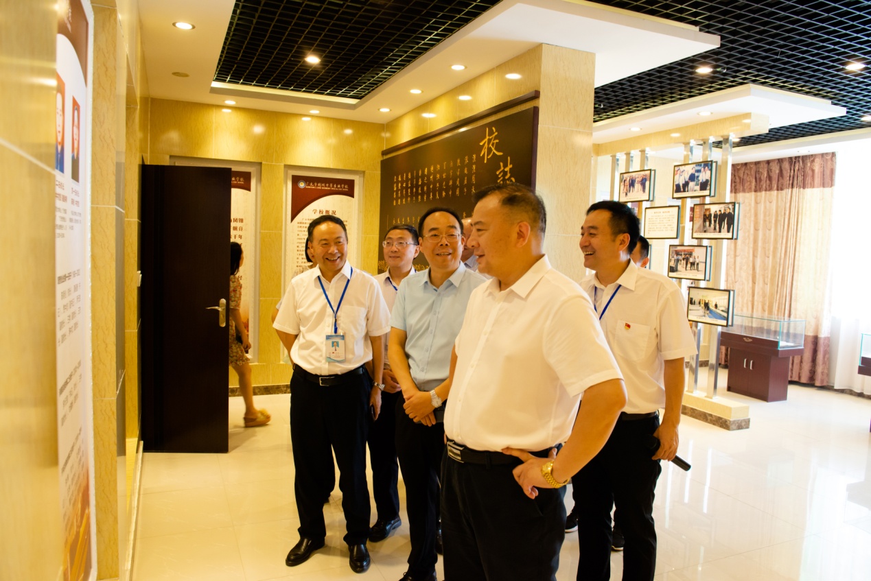 2020年7月8日,省委宣传部一级巡视员张峰一行在市委宣传副部长、市文明办主任王英荣、市人民政府督学唐军等同志陪同下对我校文明校园创建工作进行复核验收,学校李锦校长、党委杜建新书记等班子成员全程陪同检查。