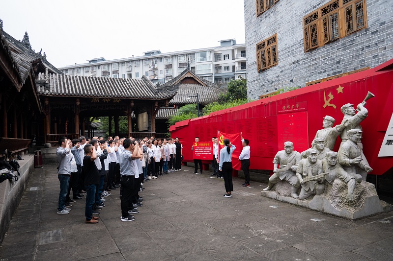 下午,党员同志们来到旺苍红军城革命遗址,在总长1300多米的三条街道和两条小巷里,汇集了川陕省委、川陕省苏维埃政府、西北革命军事委员会和红四方面军总指挥部等46处党政军领导机关旧址,是全国现存面积最大、保存最好、遗址点最多的红军遗址群之一。在这里,全体党员在领誓人杨虹同志的带领下,举起右手庄严宣誓,再次体会作为一名共产党员的责任和使命。