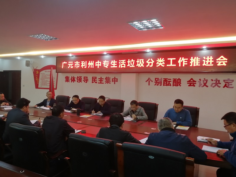 10月14日下午利州中专在行政楼会议室召开学校生活垃圾分类工作推进会,苏克难副校长主持会议,中层以上干部参加会议。