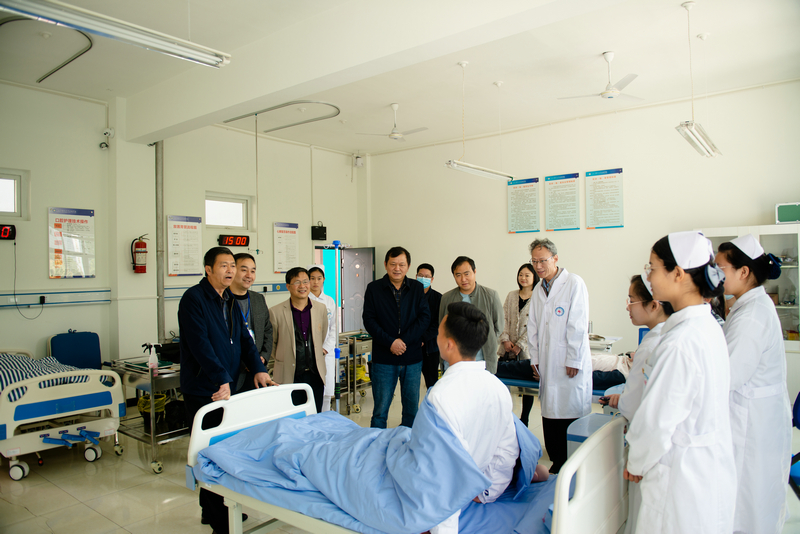 检查组一行按照疫情防控常态化要求扫码入校后,在学校党委书记杜建新、副校长贾相成的陪同下,先后到学校心理健康咨询室、毒品预防教育室、学生自主管理办公室、医护实训中心、产教融合大数据中心、监控中心等检查指导,李良彬副局长还亲自体验了护理VR沉浸式教学,详细了解学校实践教学、产教融合和校企合作情况,并与正在参加四川省职业技能大赛训练的学生进行了亲切交流。在田径场观看学校升旗仪式和国旗下讲话后,检查组到教室、寝室、食堂等学生活动重要场所检查,对干净整洁的校园环境和良好的师生面貌给予了高度评价。