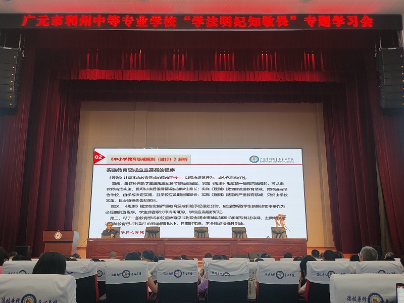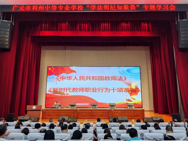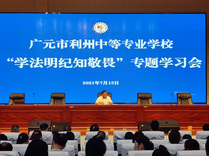 2021年7月13日,利州中专在学校多功能厅召开“学法明纪知敬畏”专题学习会,会议由校党委书记杜建新主持,全校教职员工参加会议。