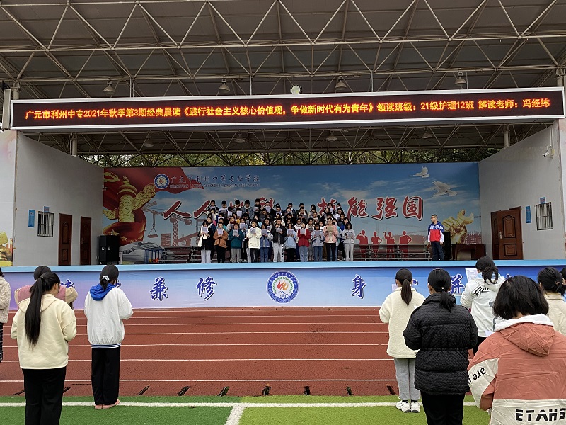 为深入推进习近平新时代中国特色社会主义思想入脑入心,培育和践行社会主义核心价值观,大力弘扬爱国主义,更好传承红色基因,建设内涵丰富的校园文化,2021年10月27日上午,学校举办了以《践行社会主义核心价值观 争做新时代有为青年》为主题的第3期经典晨读,学校2021级1900余名学生在操场集中诵读,其余学生由班主任组织在教室朗读。