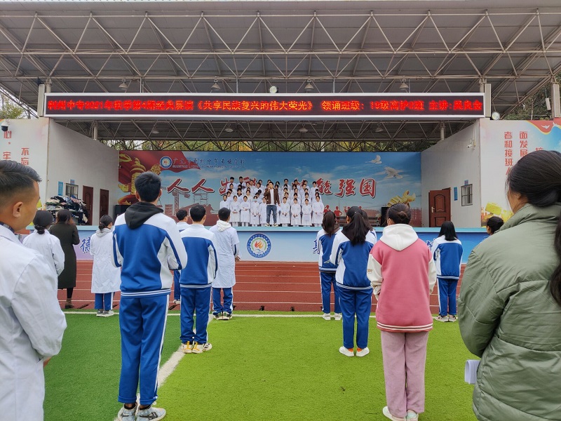 为深入学习贯彻习近平总书记关于民族团结进步重要论述综述,铸牢中华民族共同体意识,以学校第二届少数民族文化节为契机,做好新时代学校民族工作,2021年11月3日上午,学??沽艘浴豆蚕砻褡甯葱说奈按笕俟狻肺魈獾牡?期经典晨读,学校19、20级1600余名学生在操场集中诵读,其余学生由班主任组织在教室朗读。