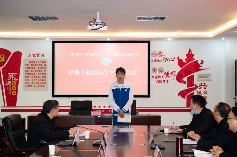 为深化职业教育改革,提升学生职业素养,拓宽就业路径,在前期项目宣讲、学生意愿调查的基础上,12月22日下午,我校与西日本良友株式会社在学校行政楼四楼会议室签订了合作办学协议。会议由副校长贾相成主持。学校班子成员、教学口干部、医卫专业教师和赴日介护留学试点班学生参加了此次会议。