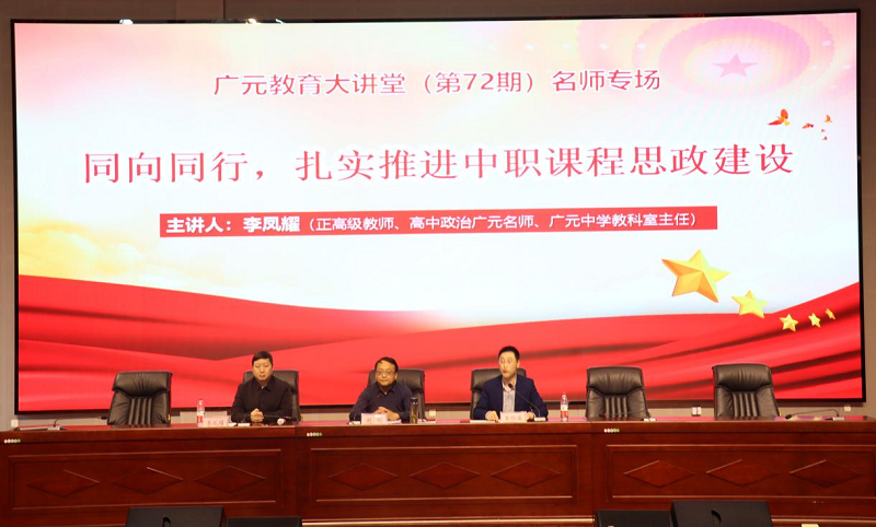 为进一步贯彻落实中共中央办公厅、国务院办公厅《关于深化新时代学校思想政治理论课改革创新的若干意见》精神,推进中等职业学校课程思政建设,全面落实立德树人根本任务,4月22日下午,由广元市教育局主办的“广元教育大讲堂(第7期)名师专场”在利州中专演播大厅举行。广元中学教科室主任、思政名师、正高级教师李凤耀受邀作了《同向同行,扎实推进中职课程思政建设》专题讲座,市教育局职业与成人教育科科长王恒满主持会议。
