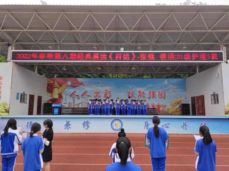 绿操场红跑道,映入眼帘的是整齐的队列,站在台上的是21级护理5班,在他们的领读下,21级所有学生一起诵读了张载的《西铭》,琅琅读书声回荡在校园的每个角落。
