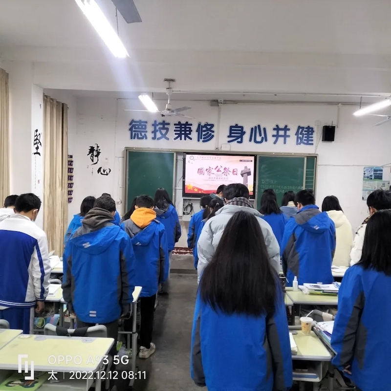 此外,全校各班还组织开展了国家公祭日主题班会。各班班主任围绕历史背景、立法历程、重大意义和历史扩展等四个方面,向同学们介绍了南京大屠杀的屈辱历史和国家公祭日的背景知识,以及我国人民在维护世界和平方面作出的巨大贡献,并通过集体默哀、齐诵《和平宣言》等方式号召同学们牢记历史、珍惜现在,为实现伟大的强国梦而努力学习,进一步激发了同学们的爱国之情和报国之志。