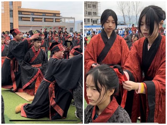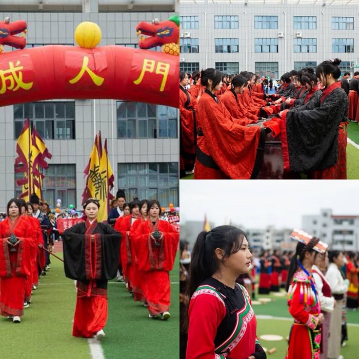 下午14时30分,伴随着优雅的鼓乐声,身着汉服的冠者、笄者,沃盥、净手、整理衣冠和身着藏、彝、羌等服饰的少数民族学生代表共同步入成人门,展示了中华文化的博大精深和强大的文化自信,勾勒出一幅民族团结一家亲的和谐美好画面。
